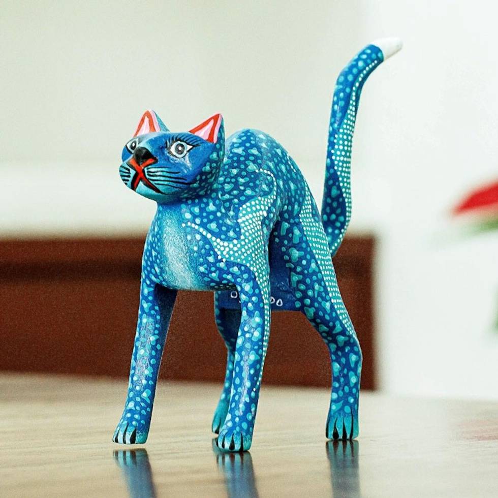 Blue and Teal Alebrije Cat with Star-Like Patterns on Body 'Celestial Cat' Item ID: 2669897931