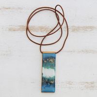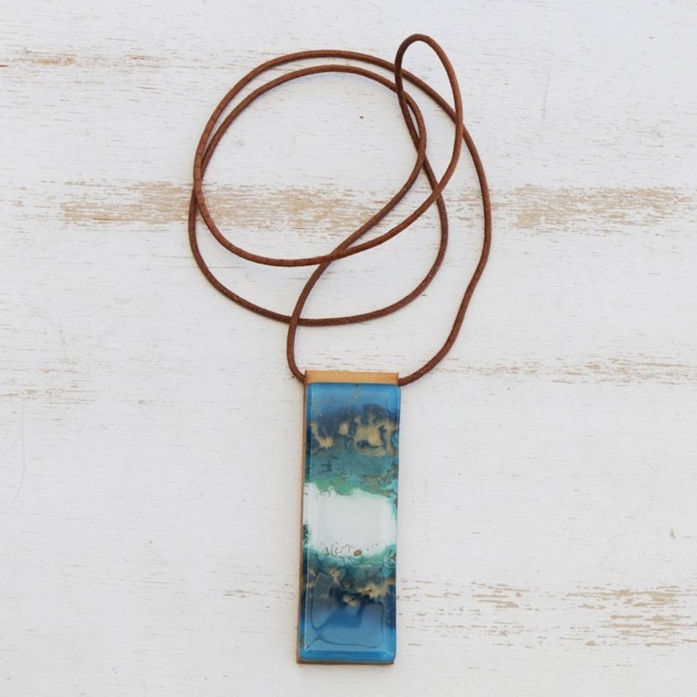 Blue and White Glass and Leather Pendant Necklace 'Cloudy Sky' Item ID: 2669935488