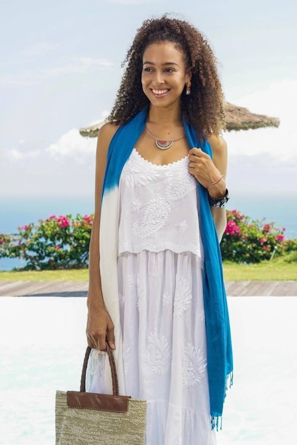 Blue and White Hand Crafted Rayon Shawl 'Night and Day' Item ID: 2671737578