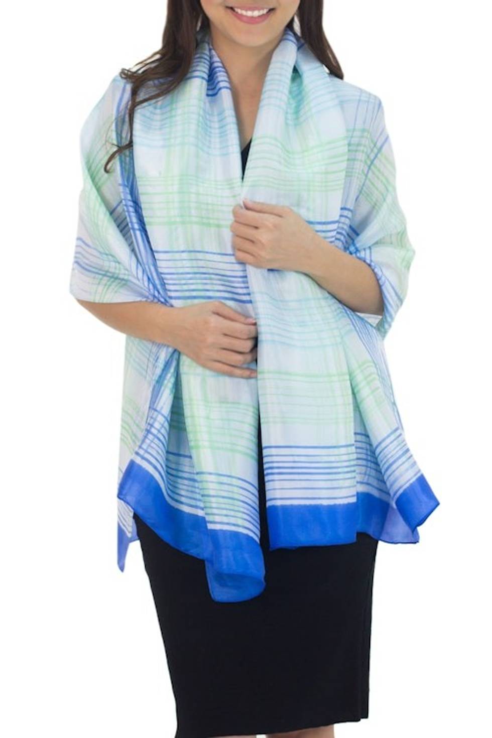 Blue and White Handcrafted Silk Blend Shawl with Green 'Cool Blue Plaid' Item ID: 2671801893