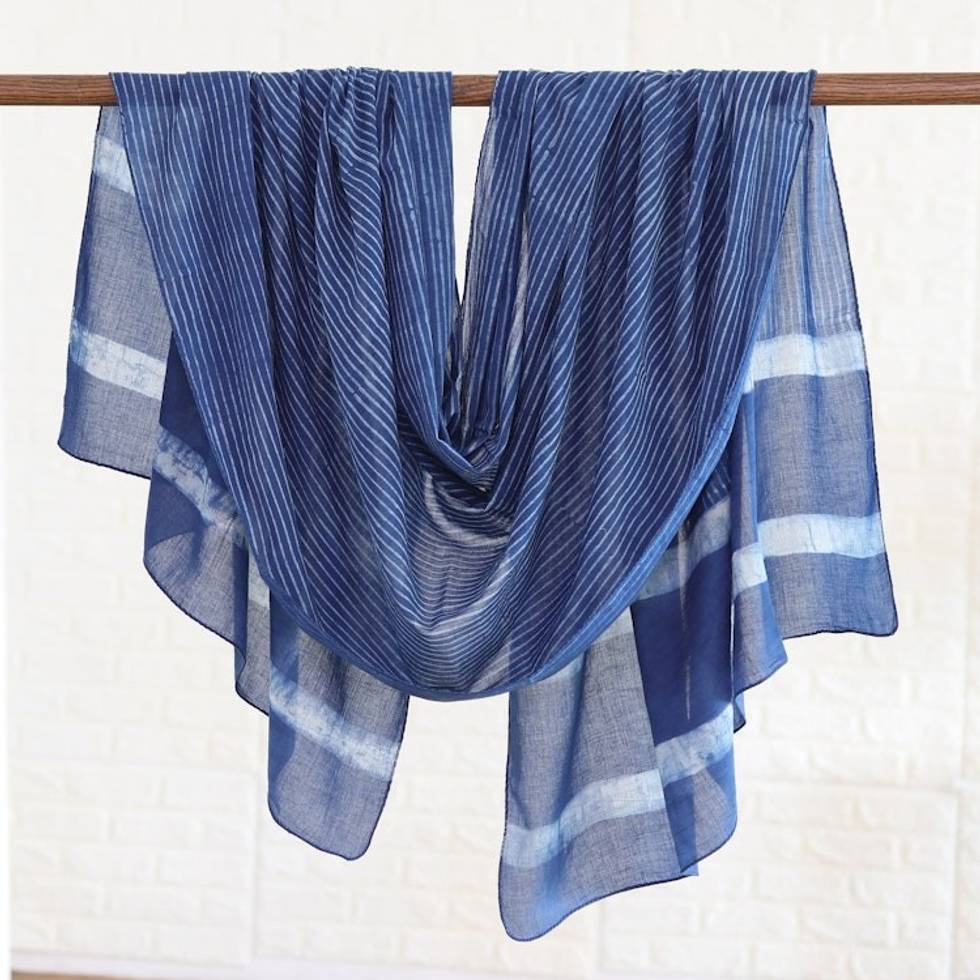 Blue and White Mud Resist Striped Block Print Cotton Shawl 'Dabu Blue' Item ID: 2669925118