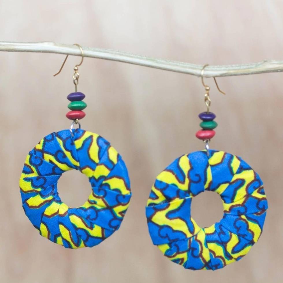 "Ghanaian artisan Esther Narh creates a stunning pair of hoop earrings that are ideal for a fun, colorful look. The artisan crafts each earring by hand with cyan and maize colored cotton fabric in a hoop shape. The earrings are crowned with three sese wood beads that add a charming accent to the vivid design."