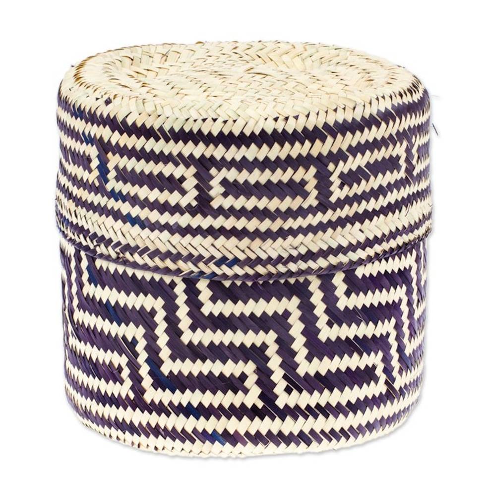 Blue Basket with Lid Hand-Woven from Palm Fiber in Mexico 'Little Navy Blue Trail' Item ID: 2669931870