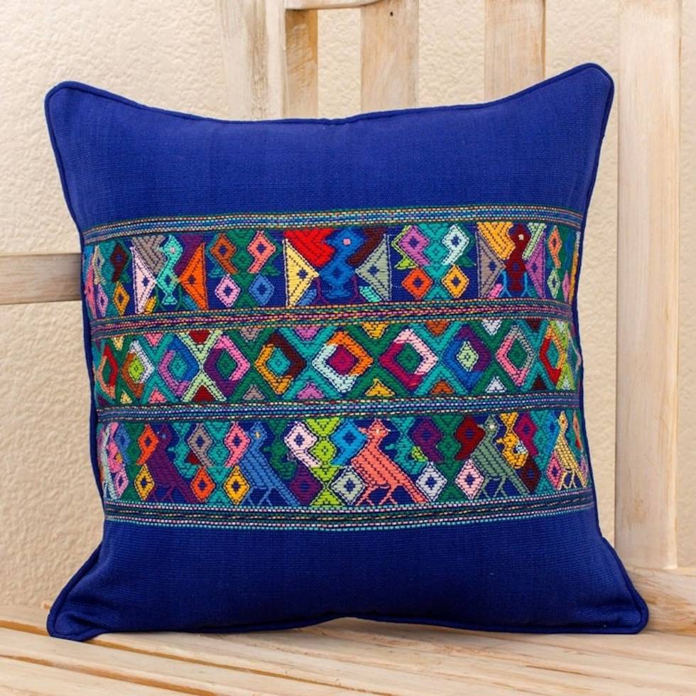Blue Bird Theme Maya Backstrap Woven Cotton Cushion Cover 'Quiche Birds' Item ID: 2671779763