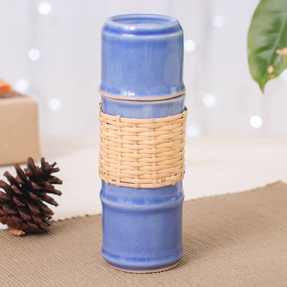Blue Celadon Ceramic and Rattan Bamboo-Themed Water Bottle 'Blue Bamboo' Item ID: 2671797141