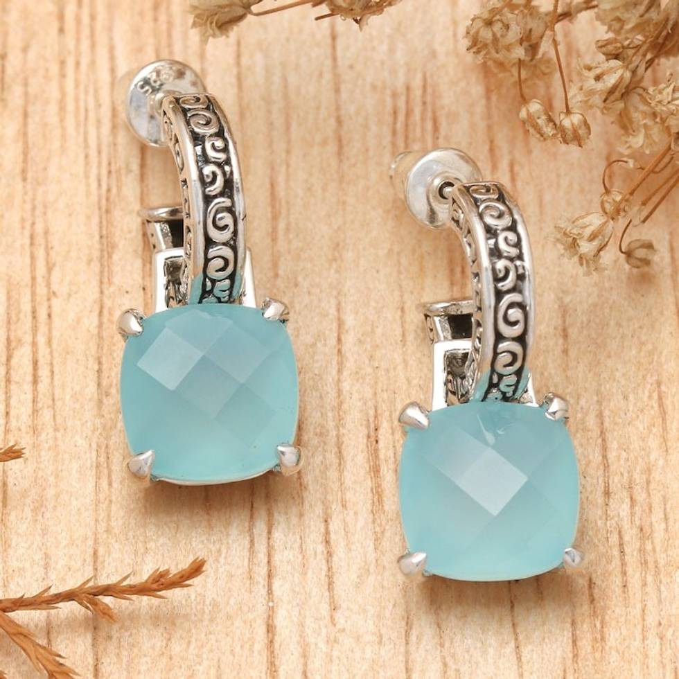 Blue Chalcedony and 925 Silver Dangle Earrings from Bali 'Buddha Hoops' Item ID: 2671733816