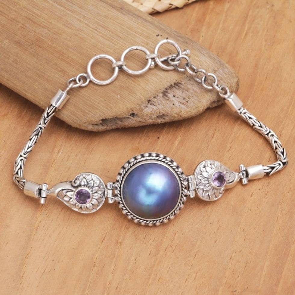 Blue Cultured Pearl and Amethyst Pendant Bracelet from Bali 'Eerie Sunflower' Item ID: 2671747932