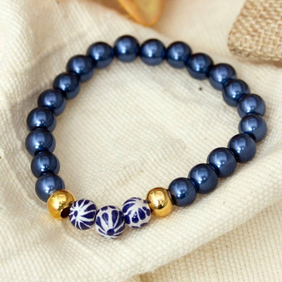 Blue Cultured Pearl and Talavera Ceramic Beaded Bracelet 'Pearly Talavera' Item ID: 2671639052