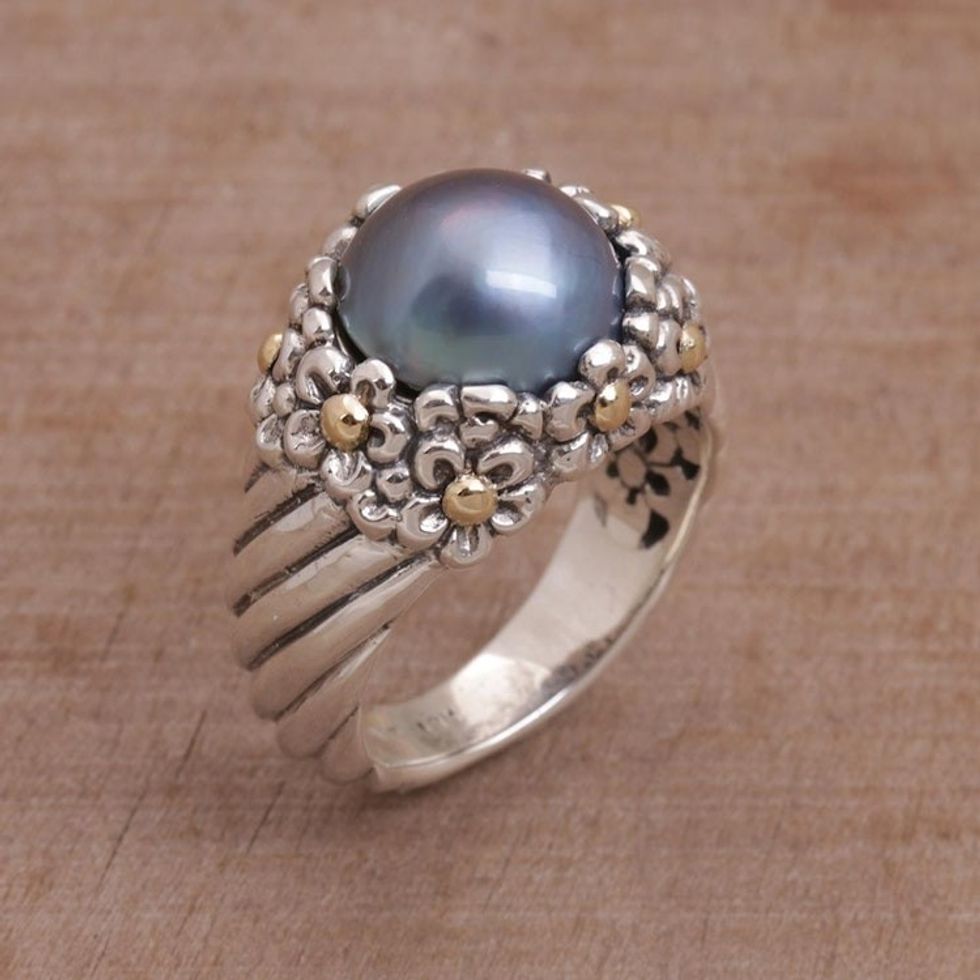 Blue Cultured Pearl Cocktail Ring with Floral Motifs 'Dusky Daisy' Item ID: 2669920639