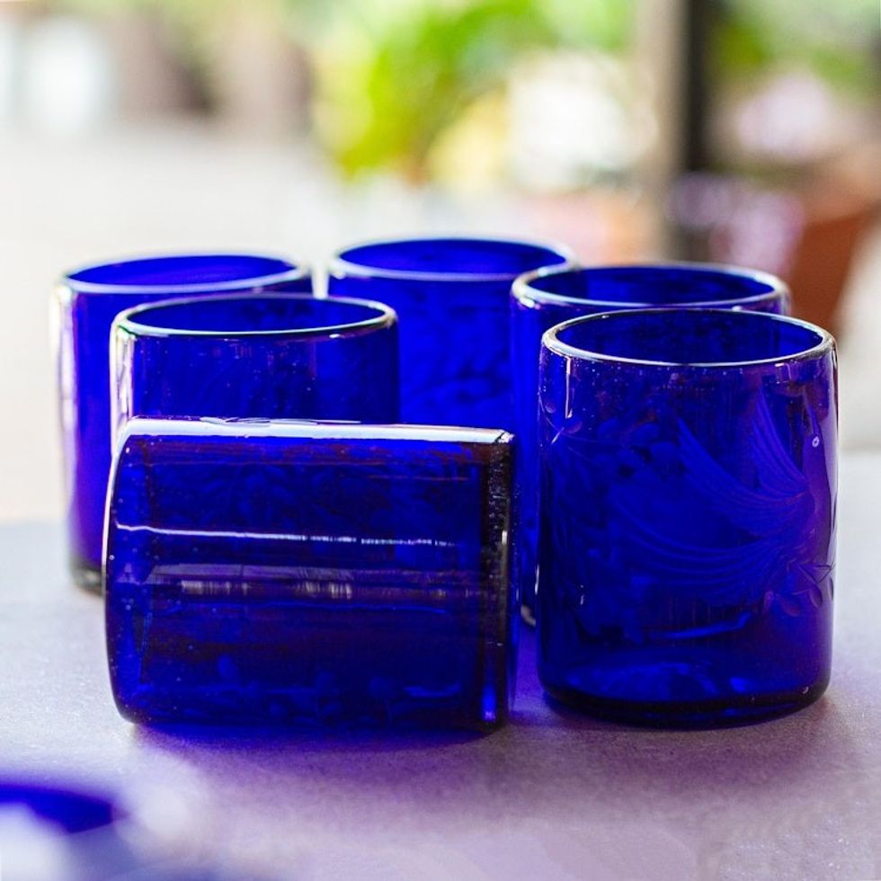Blue Etched Hand Blown Juice Glasses Set of 6 'Paloma Azul' Item ID: 2669897633