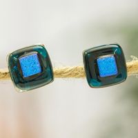 Blue Fused Glass Mosaic Stud Earrings Handmade in Mexico 'Blue Dichroic' Item ID: 2671807384