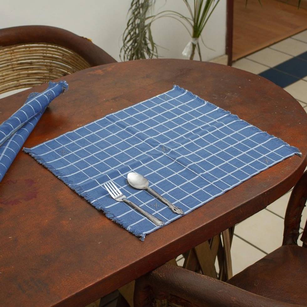 Blue-Grey Hand Woven Checkered Cotton Placemats Set of 4 'Central Highlands Blue' Item ID: 2669898051