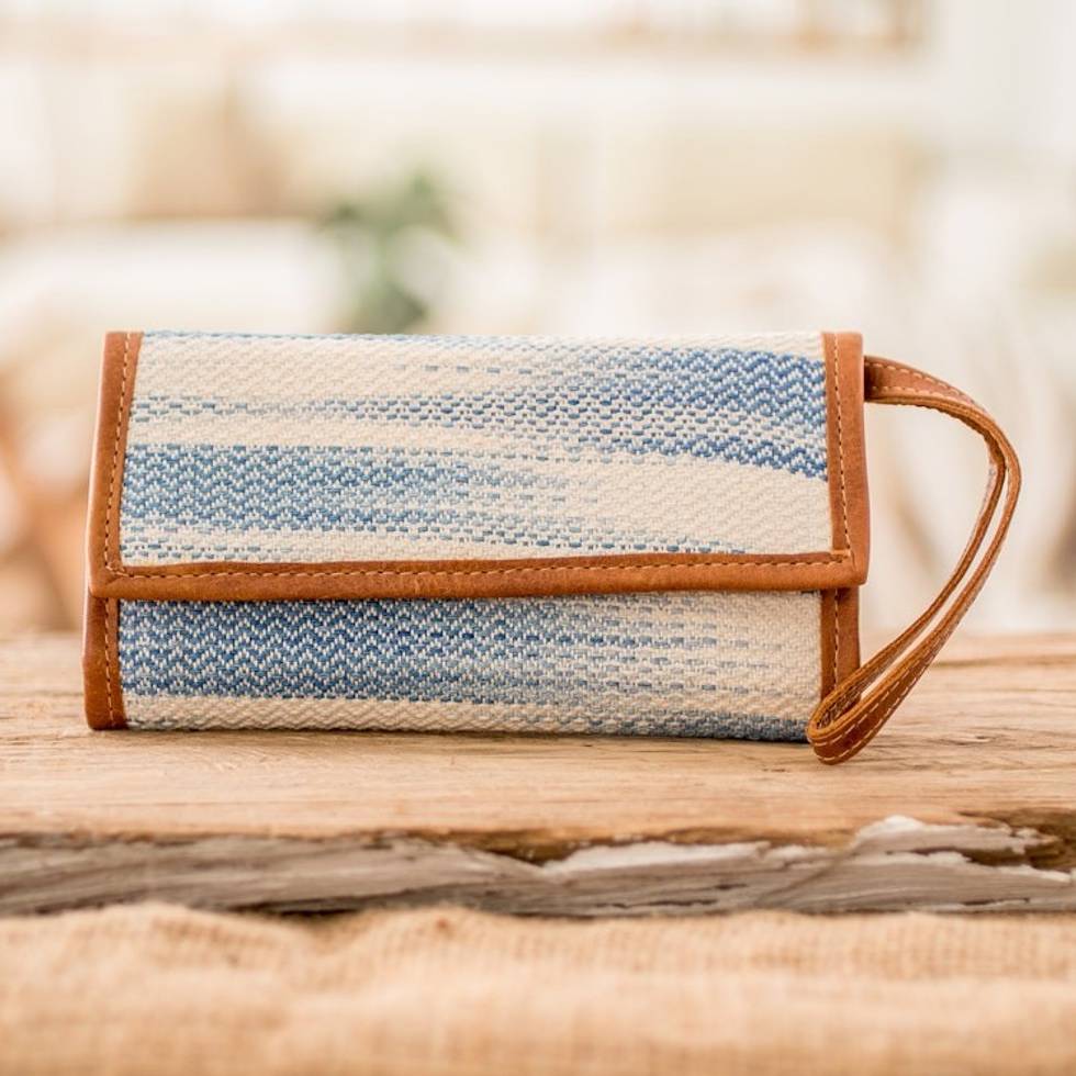 Blue Ivory Hand-Woven Cotton Wristlet with Leather Accents 'Colors of Tradition in Blue' Item ID: 2671769801