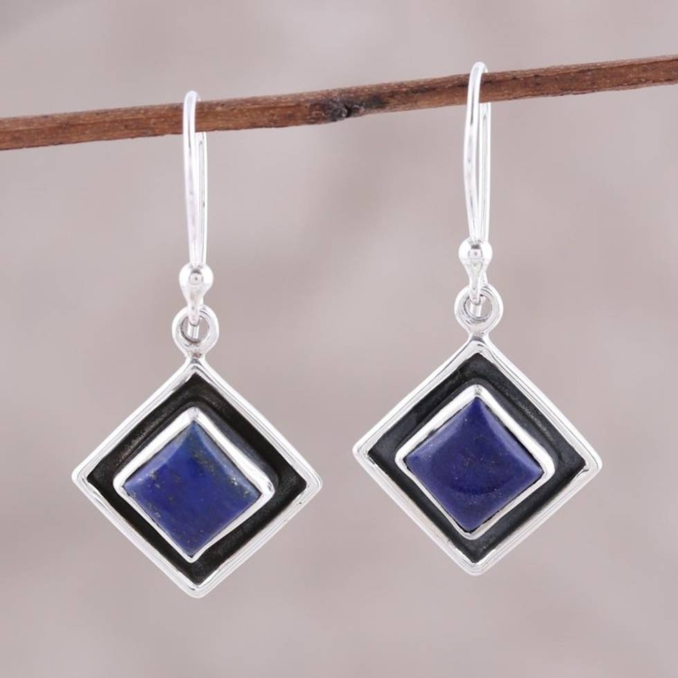 Blue Lapis Lazuli Square Dangle Earrings from India 'Chic Kites' Item ID: 2671792979
