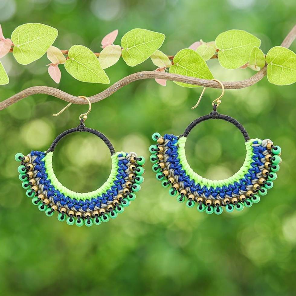 Blue Macrame Dangle Earrings with Green Magnesite Beads 'Island Nimbus' Item ID: 2671797816