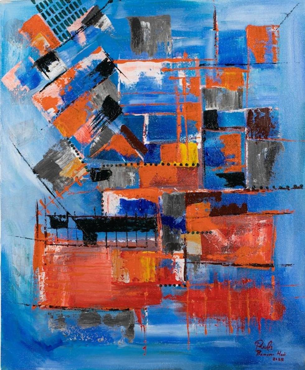 Blue Orange Brown Modern Abstract Geometric Acrylic Painting 'Train Station' Item ID: 2671765488