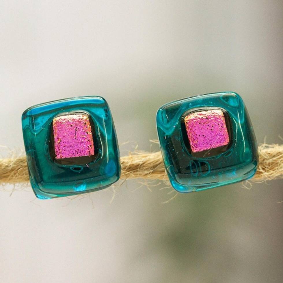 Blue Pink Fused Glass Mosaic Stud Earrings from Mexico 'Blue Rose Mosaic' Item ID: 2669926946
