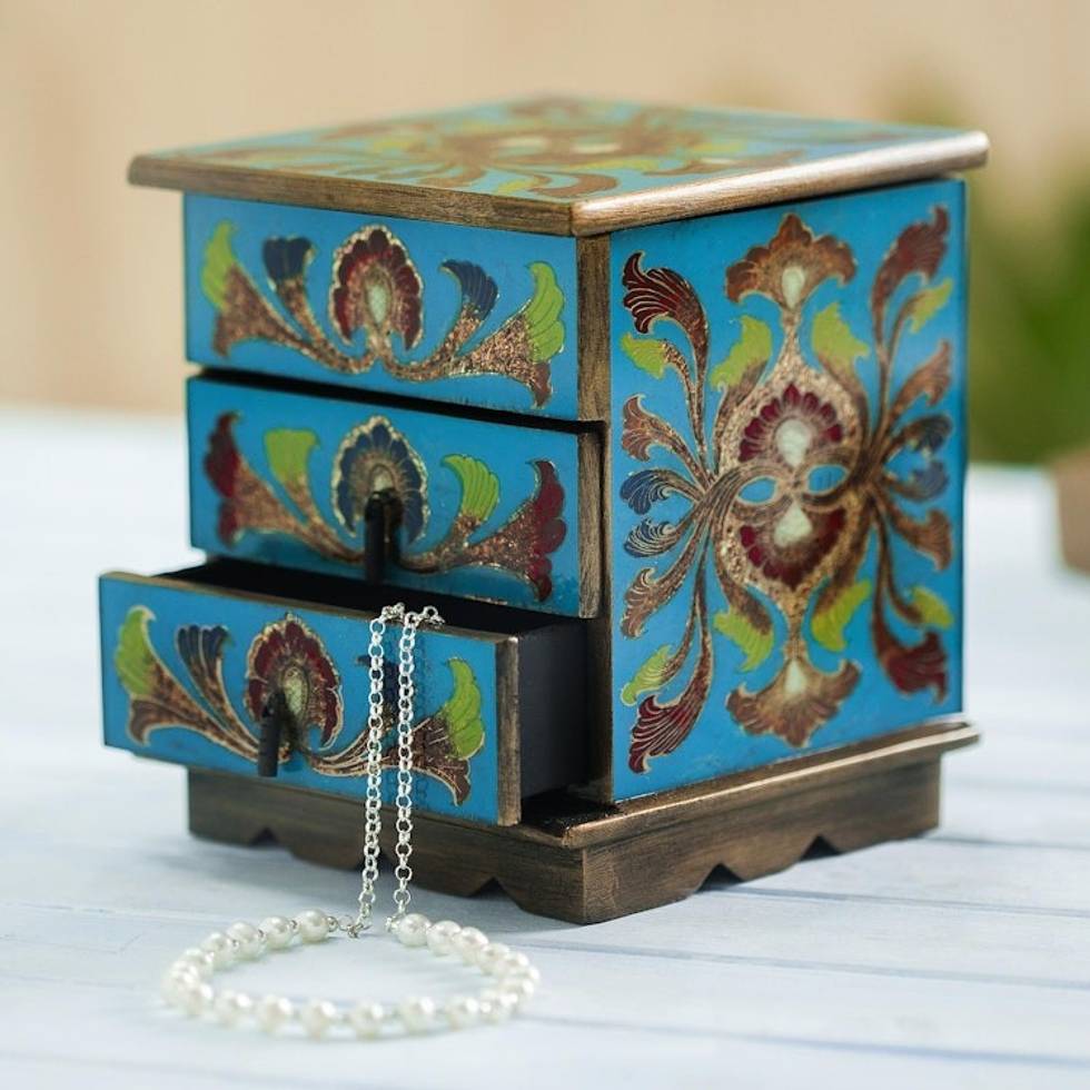 Blue Reverse Painted Glass Decorative Chest from Peru 'Joyous Blue Enchantment' Item ID: 2669904377
