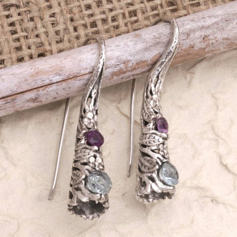 "Balinese artisan Ayu Puspita gets all the points for creativity with her design of a pair of drop earrings shaped like leaf cones crowned by round amethyst and blue topaz gemstones. The earrings are crafted from sterling silver and feature a lovely combination finish."