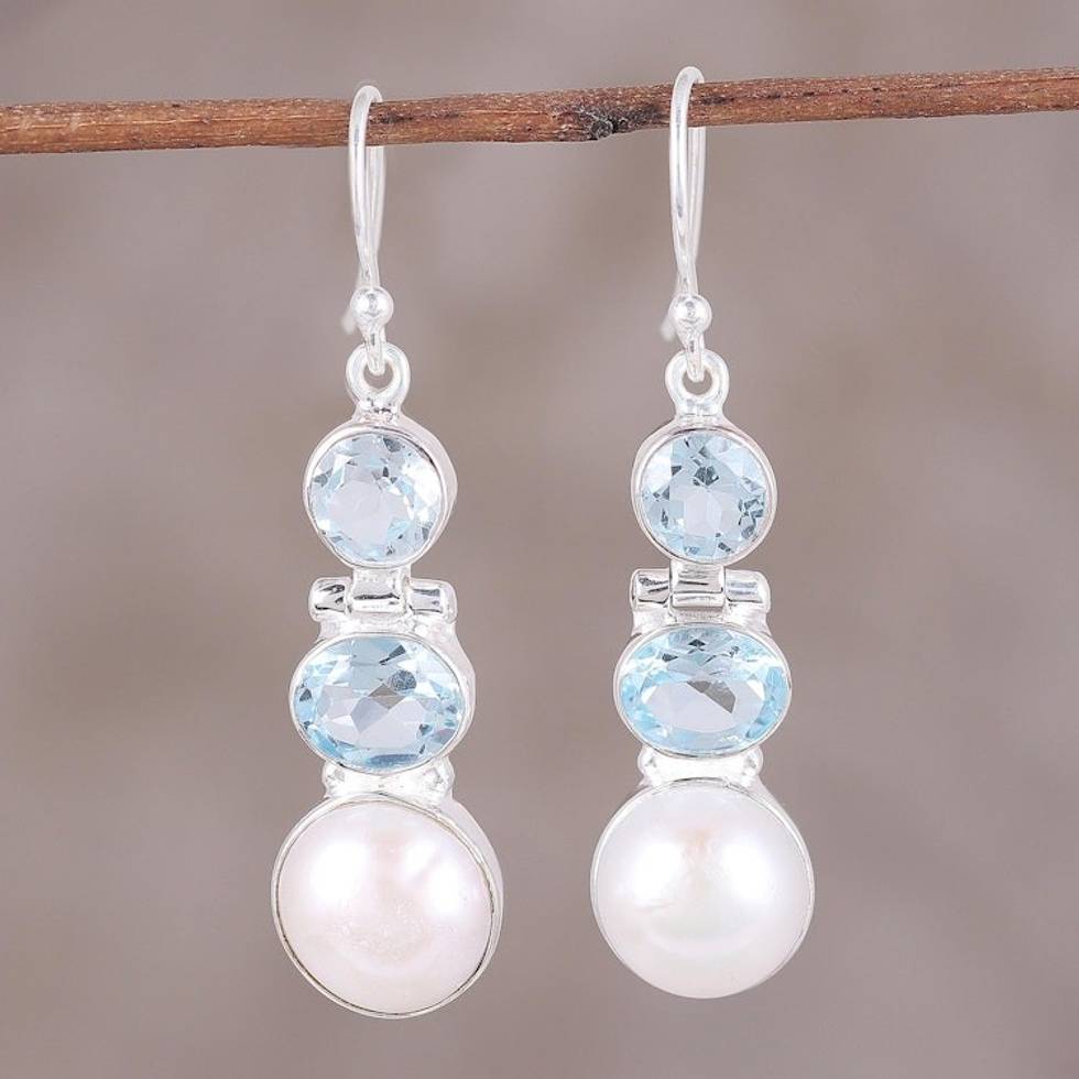 Blue Topaz and Cultured Pearl Dangle Earrings from India 'Dance in the Clouds' Item ID: 2669956041