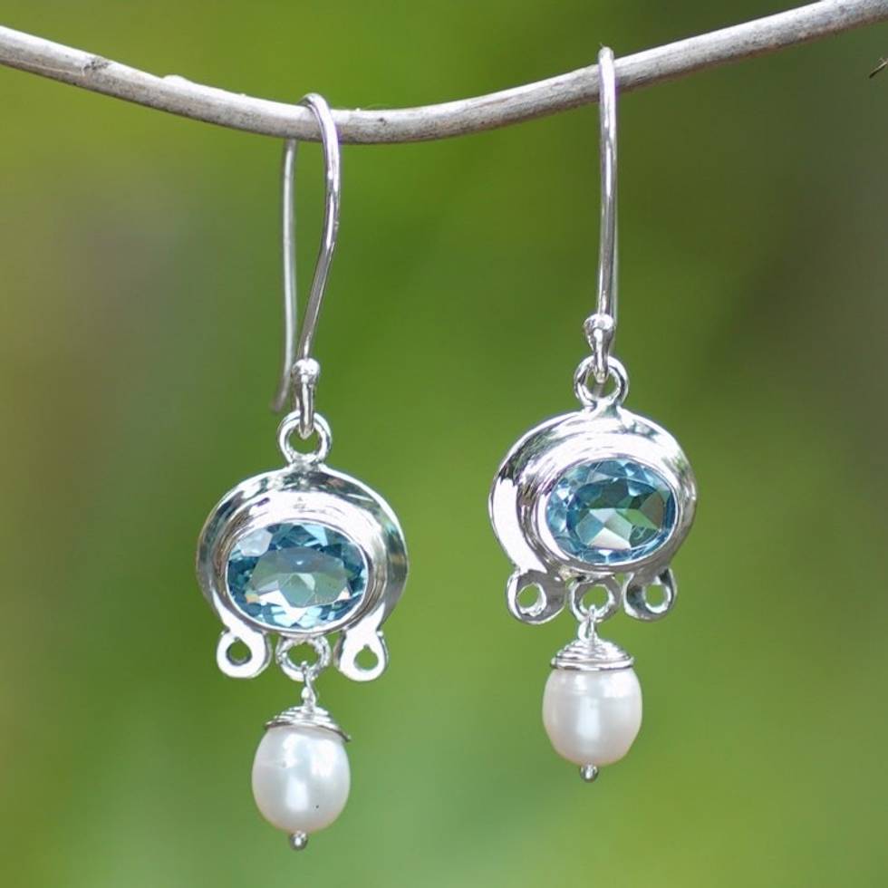 Blue Topaz and Pearl Silver Dangle Earrings 'Sky Fantasy' Item ID: 2669923473