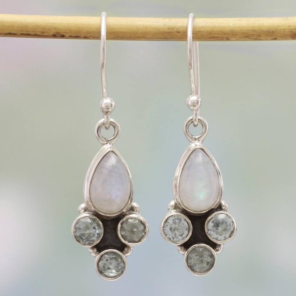 Blue Topaz and Rainbow Moonstone Dangle Earrings from India 'Enthralling Sky in Blue' Item ID: 2671793930
