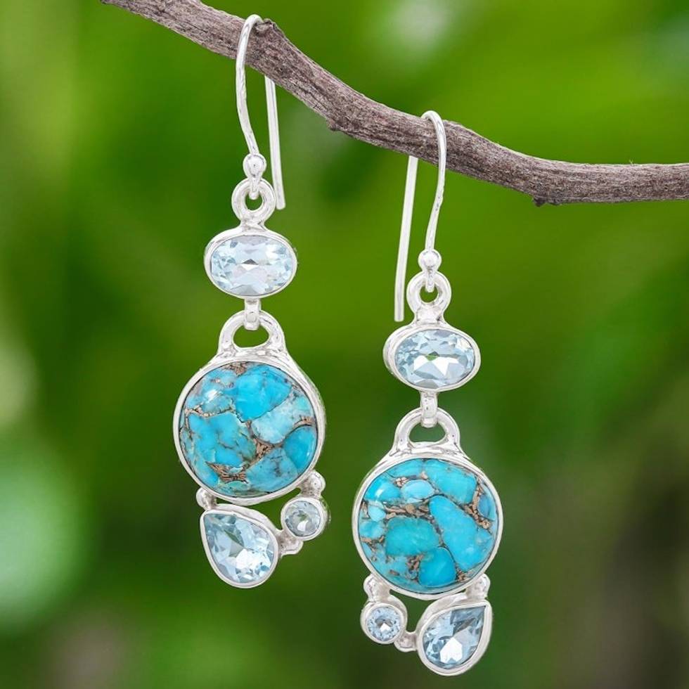 Blue Topaz and Reconstituted Turquoise Dangle Earrings 'Love Orbit in Blue' Item ID: 2671640893