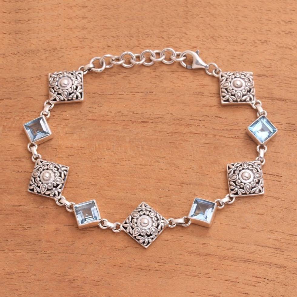 The bracelet is simply beautiful and I look forward to wearing it. The only slightly disappointing thing for me is that the topaz is such a light color blue that it almost looks clear rather than blue.