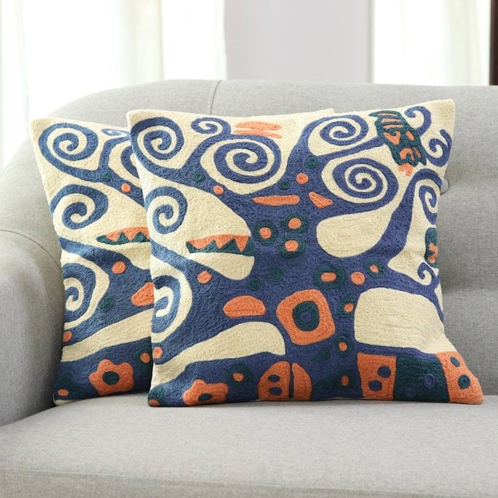 Blue Tree Embroidered Cotton Cushion Covers Pair 'Swirling Tree' Item ID: 2669956177