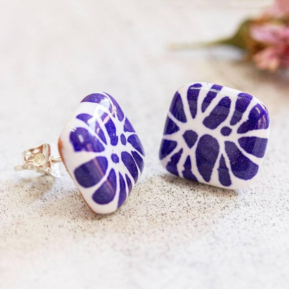Blue White Ceramic Talavera Style Square Stud Earrings 'Blue Puebla Squares' Item ID: 2669927100