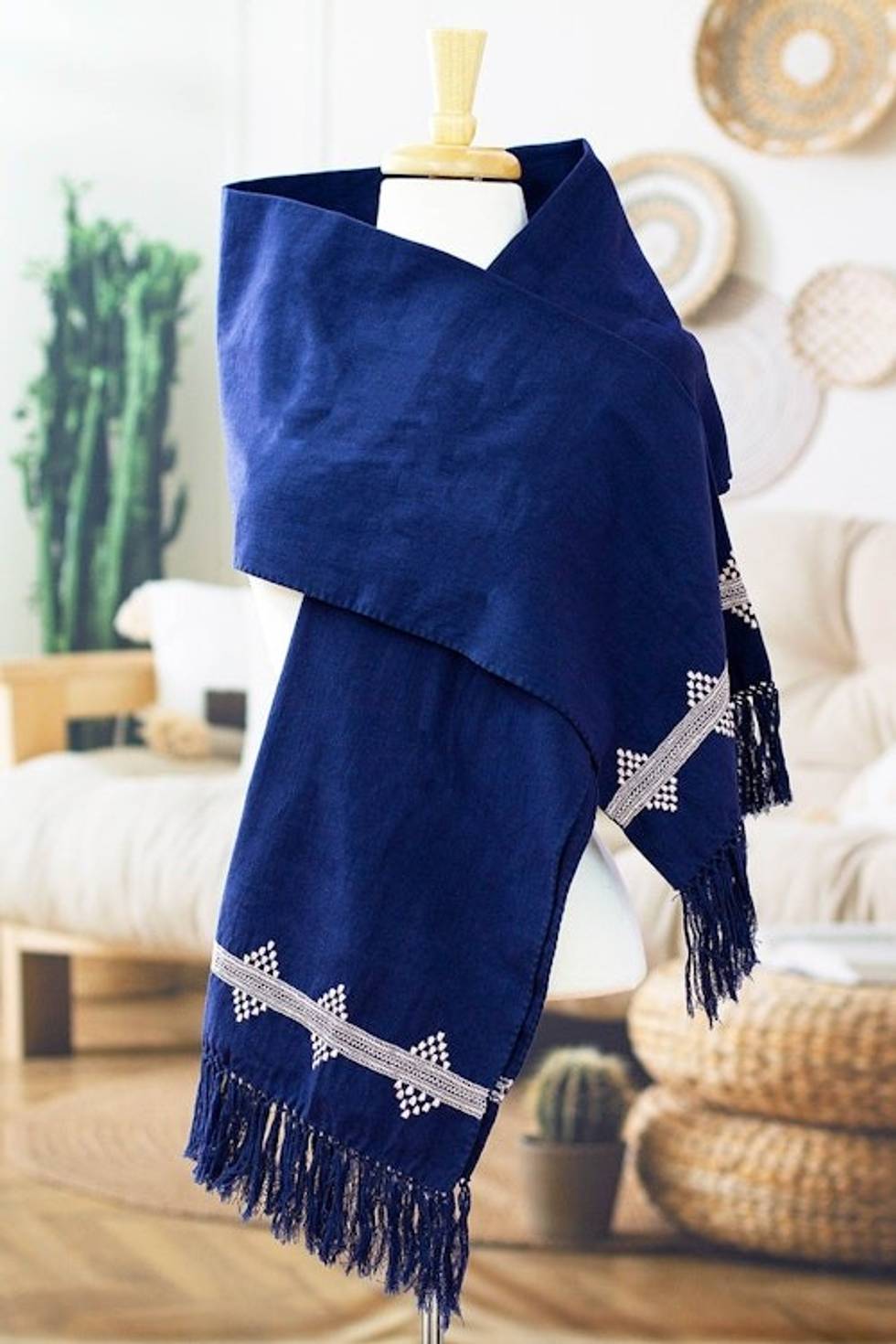 "From the traditional lands of Mexico, Petrona Patishtan shows the world the refined style of the region. After a long process that involves talent and expertise, the final result is a handloomed cotton shawl in a midnight hue with an enchanting vibe. The accessory also features classic embroidery details on each end, all in a blush tone that enhances the fringes dangling gracefully from the design."