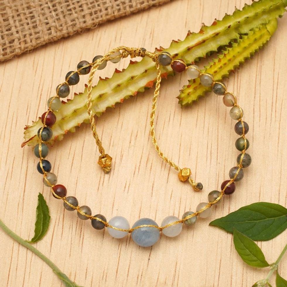 "Bali's Made Masna captures nature's spirit in this beaded bracelet, crafted from luminous bloodstone and aquamarine jewels as a symbol of peace and good fortune. The accessory joins each stone with golden polyester cords, finishing in an adjustable sliding knot, whereas 18k gold-plated brass beads crown the piece with radiant sparks."