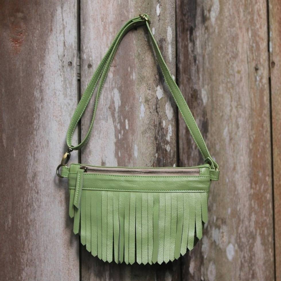 "For a bohemian accessory on your day out, this sling is designed by Javanese artisan Hilmy Arifin. She handcrafts the bag of leather. This handbag features a solid color in avocado and is detailed with elaborate fringes on one side. It drapes over the shoulder on an adjustable strap and opens with a zipper to a cotton-lined interior. A single pocket on the inside provides space for storing small items."