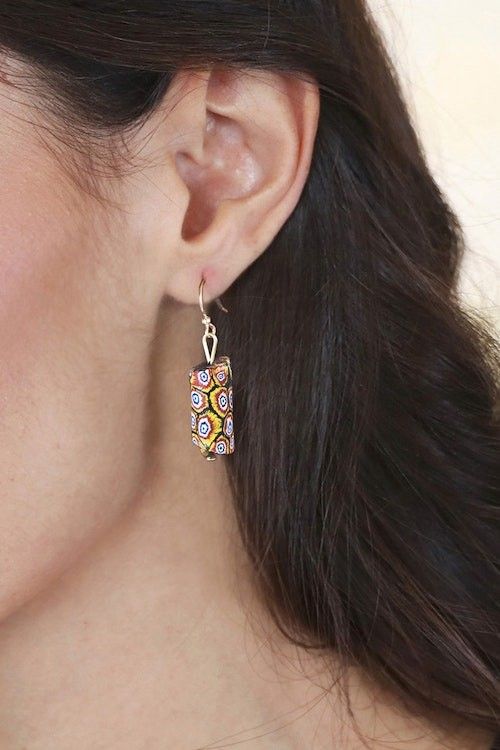 "Intense colors in a vibrant pattern create a party of boldness and beauty around Tina Quaye's newest dangle earrings. Crafted in Ghana using recycled glass beads to help reduce pollution, these charming accessories have comfortable brass hooks that allow you to wear them in all their bohemian splendor."