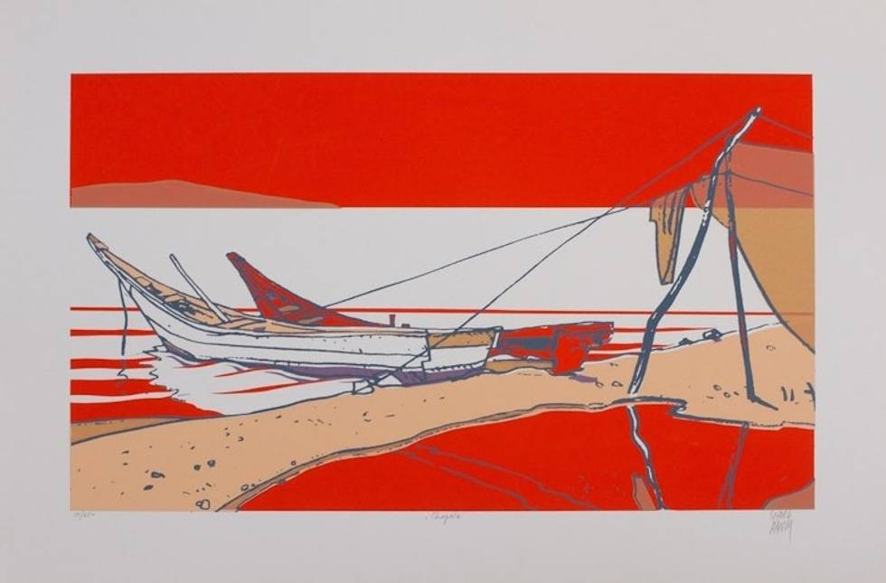 "Sunset brings the hues of Mexican fires opals to a cloudless sky over Lake Chapala. The day's work over, small boats rest near the shore beside fishing nets left to dry overnight. Artist Georg Rauch works in the silkscreen technique to create this bold limited edition print depicting Mexico's largest natural lake. After spending most of his life in Mexico, he was known as 'the most Mexican of Austrians.'"