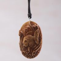 Wonderful dragon with detailed carving. Tea-colored dye makes the intricacies of the carving stand out clearly. Enjoyable to wear. I'm sure it will get many compliments. Leather cord can be resized to different lengths.