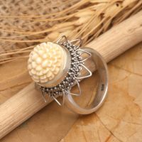 "Rosalia Tarigan admires the seruni or chrysanthemums that blossom throughout Bandung, known also as the City of Flowers. She emulates the beauty of the bloom with hand-carved cow bone for the design of this ring. The petals are detailed in sterling silver openwork for a ring of sublime elegance.