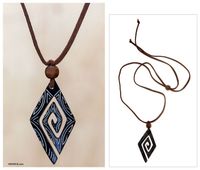 "Komang Agus Saputra looks to the skies for inspiration and designs a necklace of ethnic elegance. He carves the cow bone pendant by hand and decorates it with etched patterns that resemble constellations. The necklace includes a dark brown faux-suede cord that can be adjusted to the desired length with a chang wood bead."