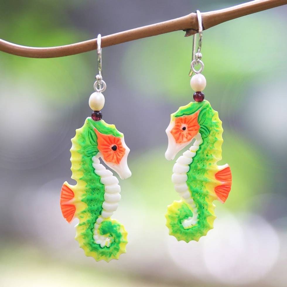 Bone Seahorse Dangle Earrings with Pearl and Amethyst 'Happy Seahorses' Item ID: 2671479996