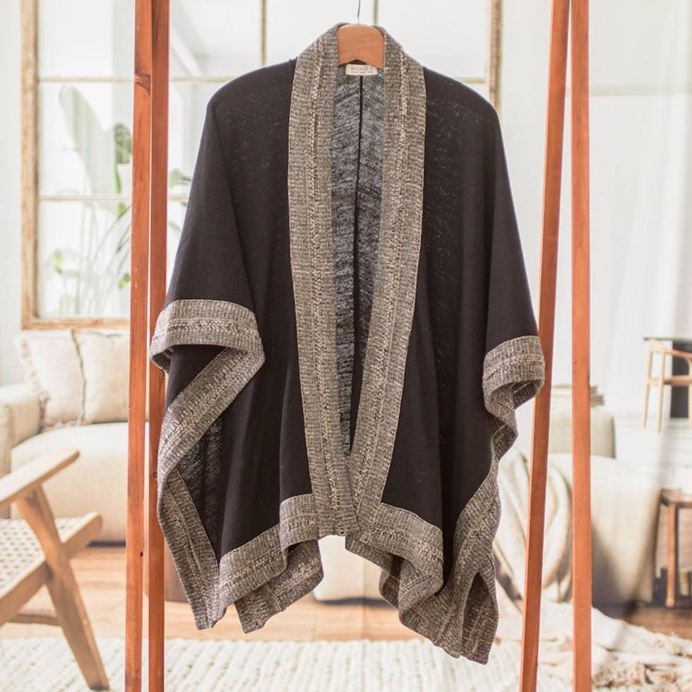Bordered Black Cotton Ruana Handloomed in Guatemala 'Nocturnal Valley' Item ID: 2669923518