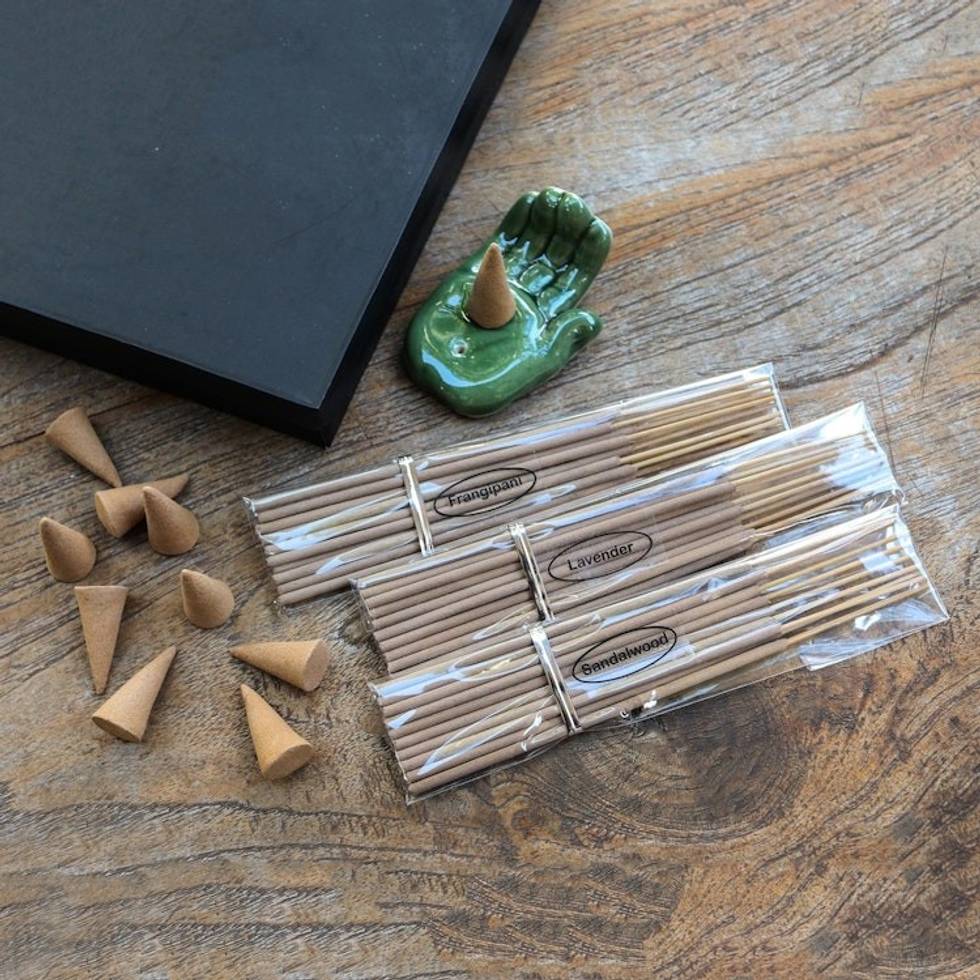 "Dewa Putra in Bali presents this boxed aromatherapy gift set. The set includes a handmade green hand ceramic incense holder as well as a variety of incense. There are 6 sticks each of incense in frangipani, lavender, and sandalwood scents, as well as 5 cones each of frangipani and sandalwood incense. The set arrives in an attractive box suitable for gifting."