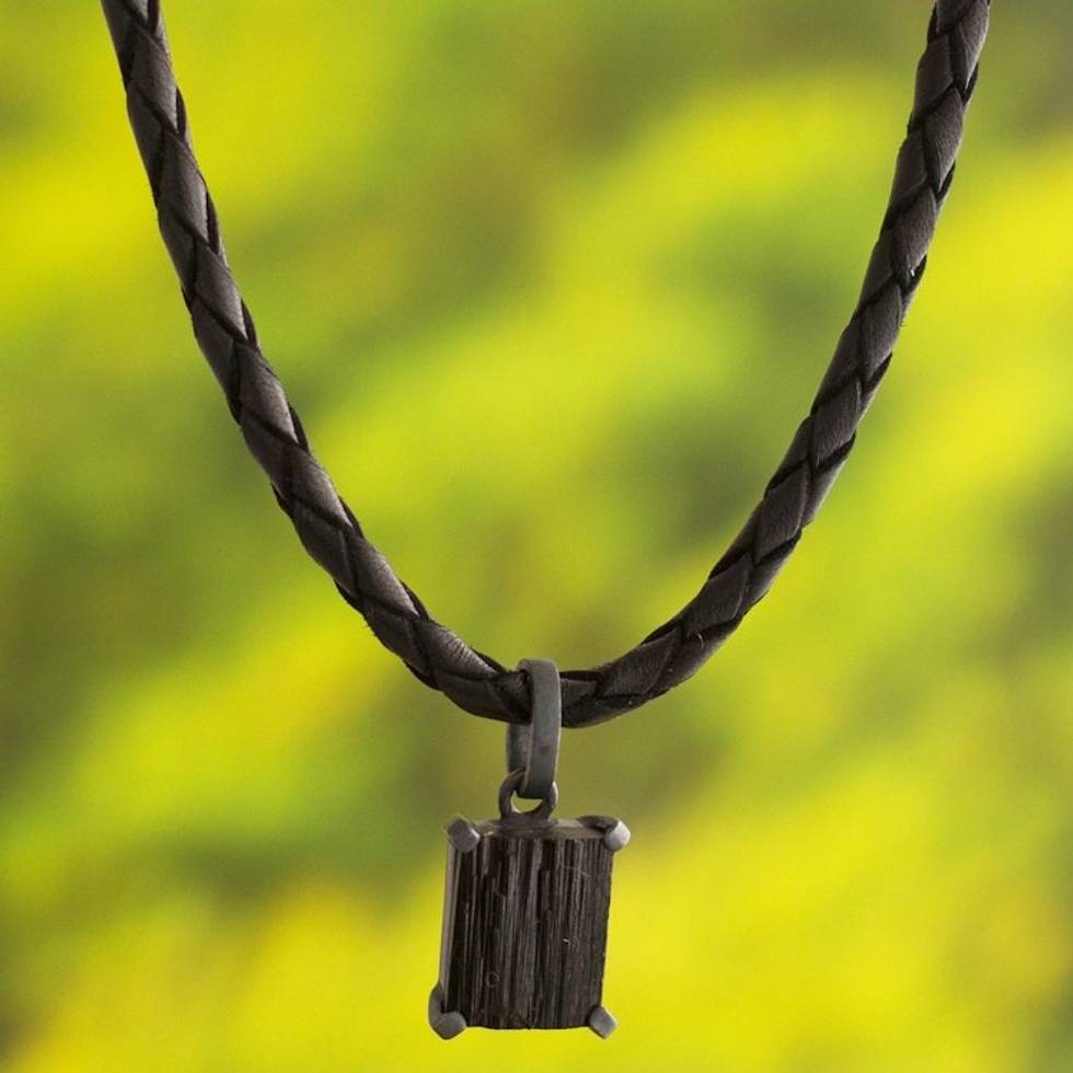 Braided Black Leather Cord Tourmaline Pendant Necklace 'Monochrome Mystery' Item ID: 2671691307