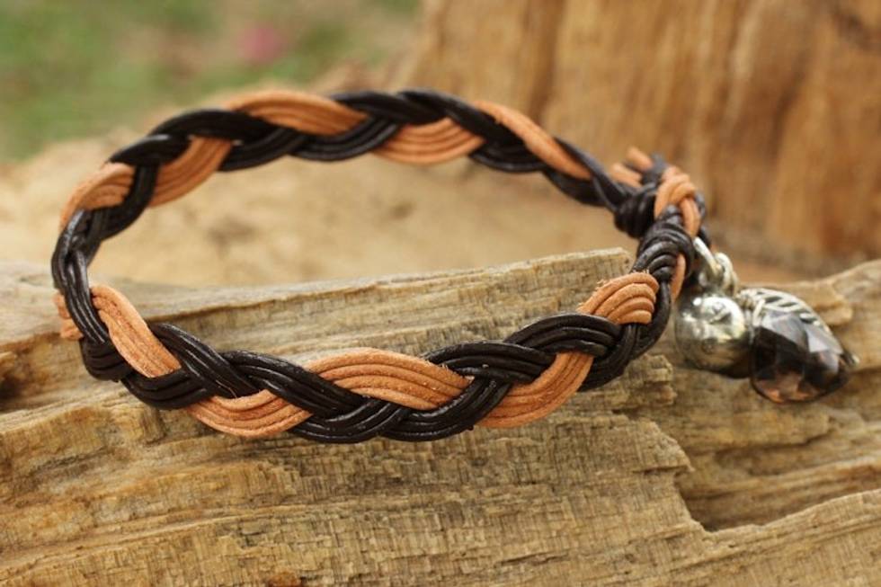 Braided Leather Smoky Quartz Bracelet with Hill Tribe Silver 'Joyous Nature' Item ID: 2671803190