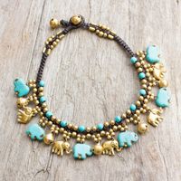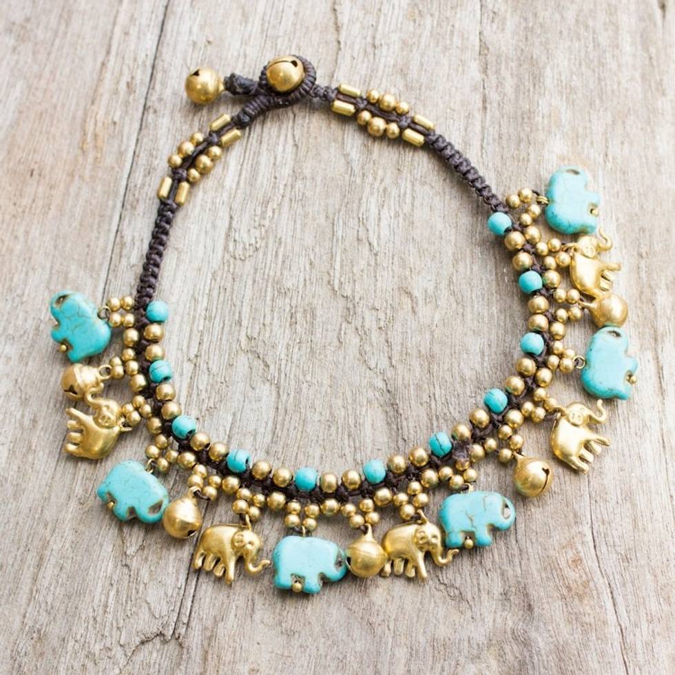 Brass Elephant Anklet with Blue Calcite and Jingling Bells 'Elephant Parade' Item ID: 2669926059