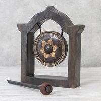 "A dazzling star centers this traditional gong from Thailand. It is from the tam-tam gong category with a distinct 'crash' sound when struck with the rain tree wood mallet with a red rayon head. From Jaifah Aksornsri, the brass gong centers a rain tree wood frame that is carved by hand in the shape of a temple door."