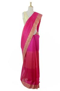 Bright Pink Cotton and Silk Blend Sari with Golden Borders 'Fuchsia Charm' Item ID: 2671793880