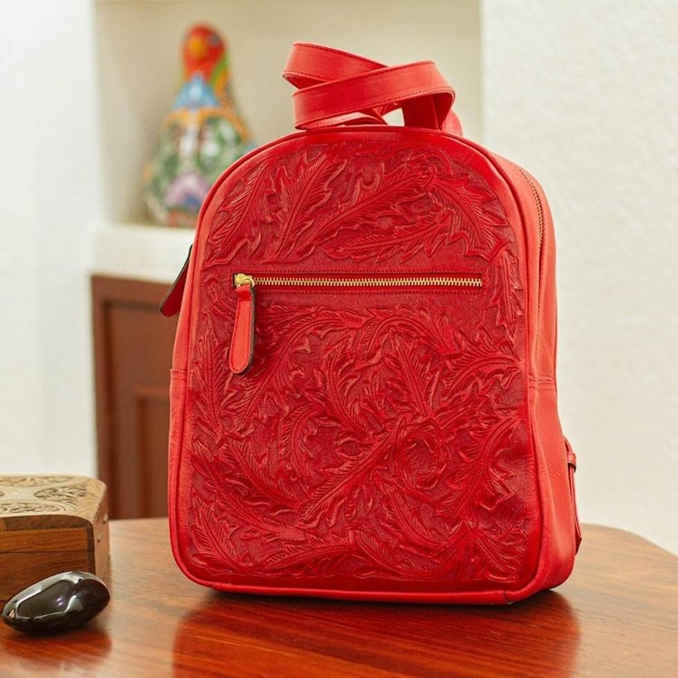 Bright Red Tooled Leather Backpack 'Falling Leaves in Red' Item ID: 2671808377