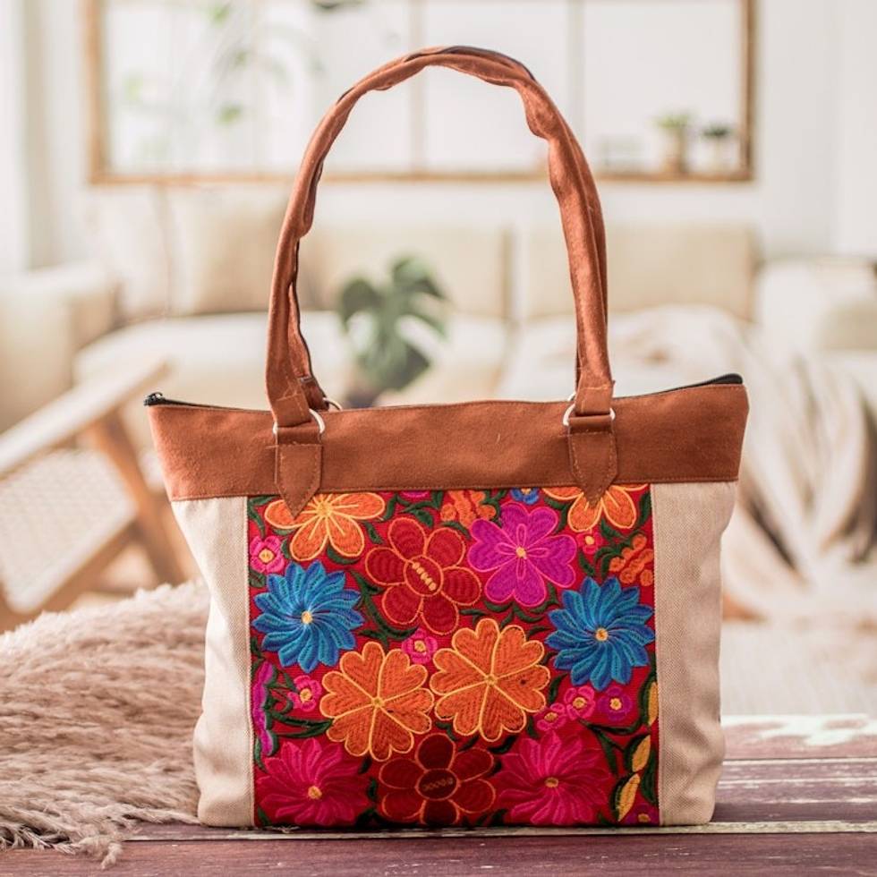 Brown and Ivory Tote Bag with Handwoven Floral Designs 'Floral Elegance' Item ID: 2671656309