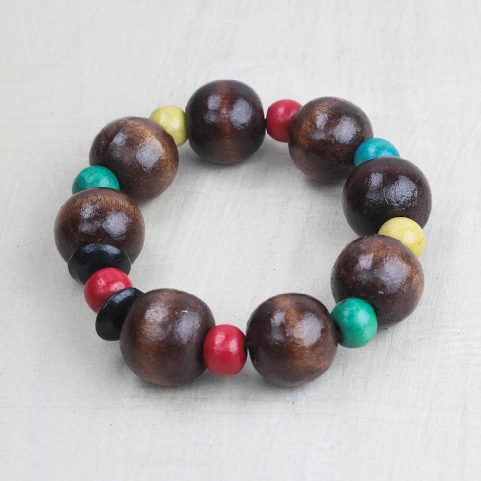 Brown and Multi-Color Wood Bead Stretch Bracelet from Ghana 'Joyful Together' Item ID: 2671806381