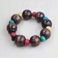 "Ghanaian artisan Esther Darko handcrafts a colorful beaded stretch bracelet that will bring a smile to your face. Large, round sese wood beads in rich brown alternate with smaller round colorful wood beads in red, yellow, and green. Flanking one red bead are two black wood discs. The result is an eye-catching look perfect for every day wear."